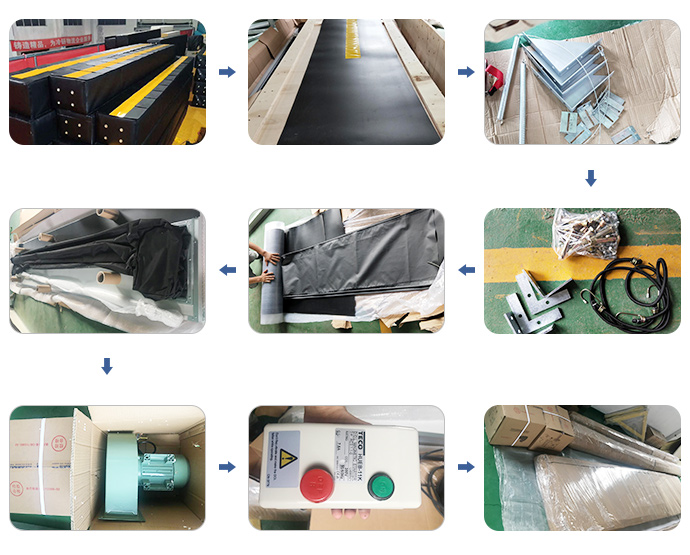 有頂部密封柱和兩個側(cè)密封柱。該材料為氯丁橡膠合成織物,密封柱為連續(xù)的圓柱形,由外部鼓風(fēng)機(jī)連續(xù)充氣,各部分設(shè)有平衡孔。因此,整個工作狀態(tài)將緊緊地包裹著卡車車廂。達(dá)到密封效果。