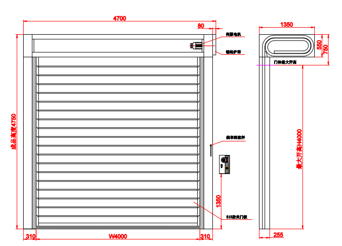 硬質快速門整體外觀;采用寶鋼鍍鋅板經激光切割、數控折彎而成的成型的渦輪系統、導軌系統、防護外罩,長久不生銹,外部美觀、防塵、輕松清潔傳動系統;一體式的傳動系統,使得門體兩側均勻受力,整體運行通暢。