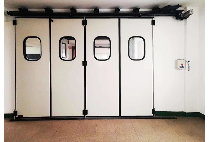 工業電動折疊門的門扇常見的四扇、六扇、八扇等,這是根據門洞的寬度來決定的。門扇又分為邊門扇和中門扇,其中邊門扇一邊的邊框與中門扇之間通過鉸鏈來進行連接,邊門扇另一邊門框的上下端則是分別裝有上、下轉軸,轉軸與門洞兩邊門框的上、下轉軸座相連接,如斯以來當邊門框繞著一邊挺旋轉時,就會同時帶動中門扇一起旋轉至90°,從而便門扇實現開啟和封閉動作。